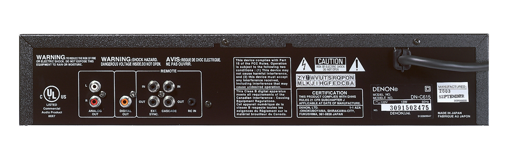 Denon DN-C615 是一款机柜式 CD/MP3 混合播放器,设置了模拟 AND 数字 I/O ,防震存储器和音调控制器。该产品不仅能够播放 CD 和 MP3 ,还能播放 CD-R 和 CD-RW 光盘,支持即刻播放。您可以通过其前面板的控制器选择单音轨、连续或随机播放模式以及三个不同的结束模式—停止、下一首和重新搜索。除此之外,该产品还设置了 S/PDIF 同轴输出接口和立体声 RCA 模拟输出接口。