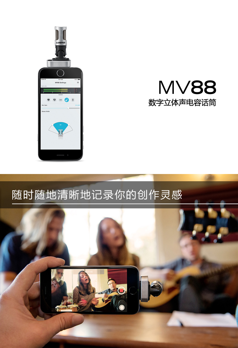 MOTIV MV88数字立体声电容话筒采用创新的中-边架构,实现清晰的立体声效果,可通过Lightning接口直接连接到任何Apple设备,成为功能强大的移动录音设备,实现录音棚品质的录音。紧凑型MV88的话筒元件安装在创新的90度转轴上,可以非常灵活地调整话筒位置。可与免费的ShurePlus™ MOTIV™ Recording iOS App配合使用,实现细腻的实时音频控制,包括五种内置DSP预设模式(演讲,歌唱,平直,声学乐器,乐器扬声器),提供高质量的24位/48 kHz录音。MV88堪称完美的高保真移动音频捕捉解决方案,适用于各种场合:现场演出、采访、视频附加音频、人声和乐器录音。它采用经过舒尔测试的全金属构造,带有防风罩,在任何环境下均可提供持续可靠的性能。
