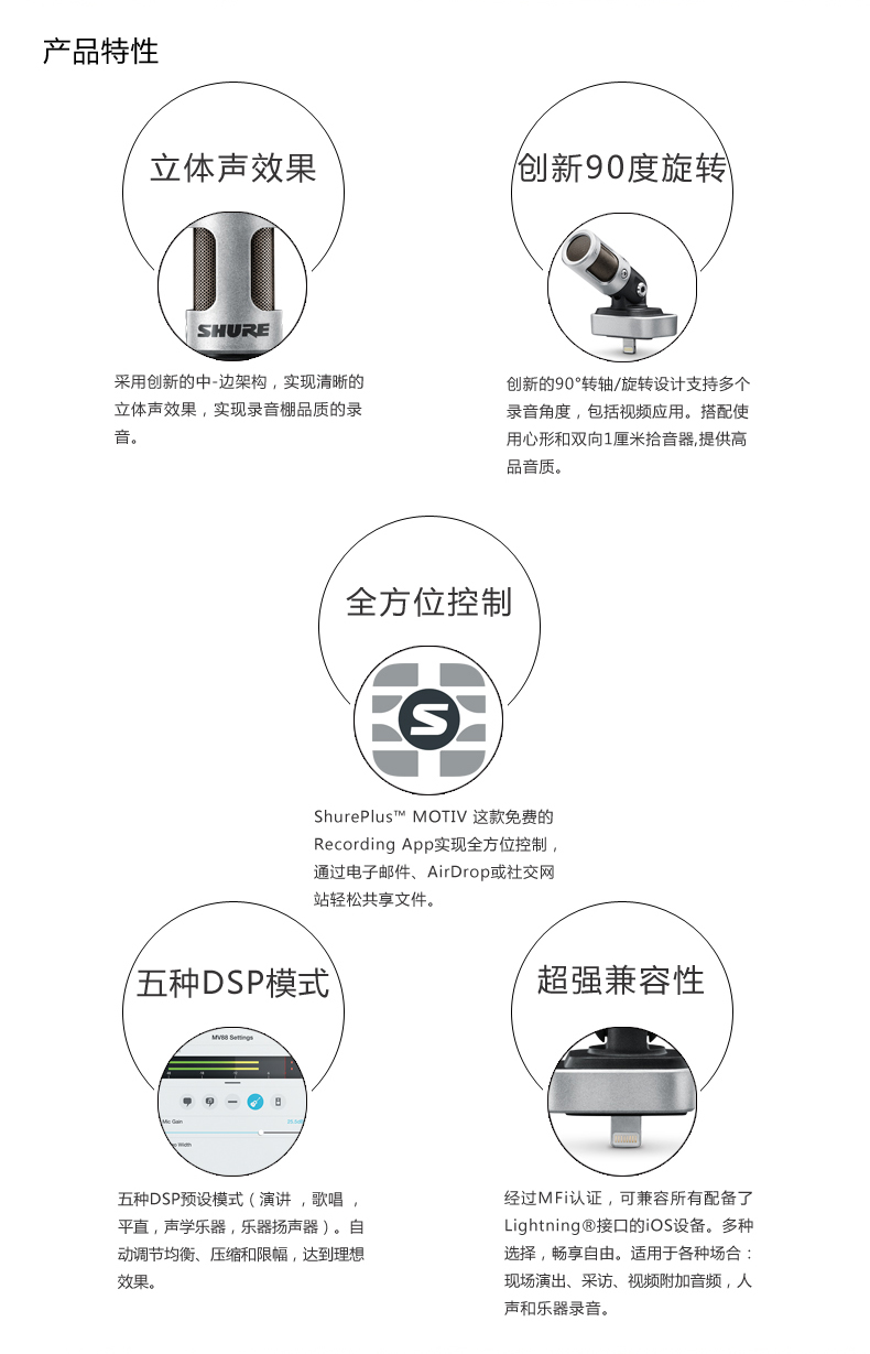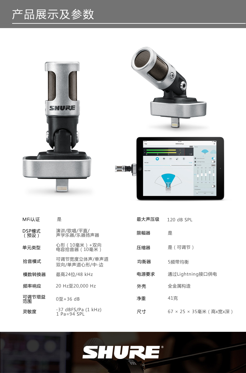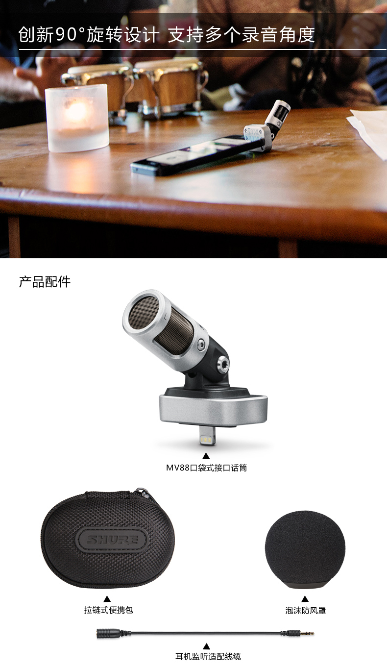 数字立体声电容话筒,可通过Lightning接口连接Apple设备,用于现场演出、采访和家庭环境的移动高保真录音。
