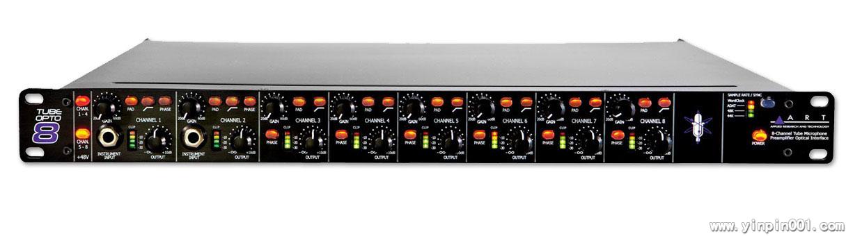 The ART TubeOpto 8™ is the ideal Eight Channel input / output expander for any ADAT lit-pipe equipped audio interface, direct-to-disc recorder or DAW. Eight high quality second generation discrete Class–A vacuum tube microphone preamps are packaged in a single rack space unit with eight channel 24-bit digital I/O.