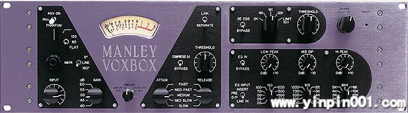 这是一个采用真空电子管的话筒放大器,它还配备了Opto压缩器、Pultec均衡器、De-esser、峰值限幅器。一个完全采用电子管设计,集成于一个完整单元中的声音处理通道效果器。它的话筒放大器部分包含了一个变压器平衡输入、可开关的48V幻象供电和一个LowCut开关。压缩器部分采用了Manley的可变MU及Opto隔离技术。均衡器部分则可以对33个频率分为3组频段进行完全的控制调整。设备同时还提供一个De-esser功能和限幅器,并提供一个完整尺寸的带照明VU表。