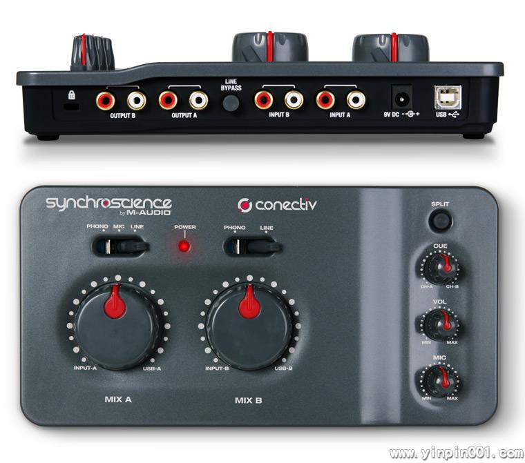M-Audio公司旗下新部门-SynchroScience产品开发部为DJ全力开发他们需要的工具——便携式的强大的Conectiv接口便是明证。两对立体声输入和输出、简易的USB连接、以及Torq DJ 软件,使得Conectiv能够将任何可兼容的Mac电脑或个人电脑变成DJ的利器。两个大旋钮可让你在天衣无缝地对转盘或CD播放机上的音频和与之连接的电脑音频进行调音。Conectiv还具备标准的DJ提示监听功能,因此,在将它发送到房间系统上之前,你可以听到耳机中的任何音轨。