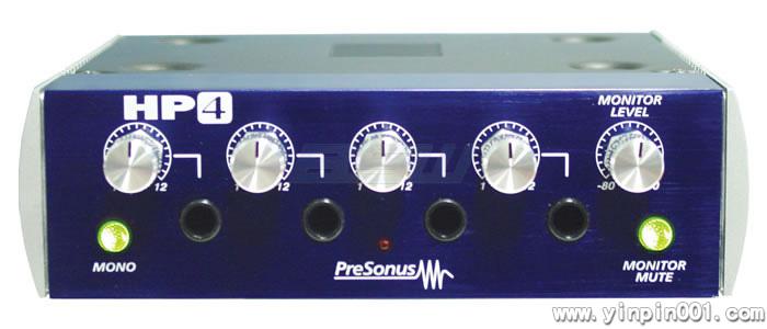 HP4是PreSonus面向企业录音棚开发的体积小、价格低廉,但具有专业规格的耳机分配器。与TubePre一样仅占1/3 机架宽度。可以工作在平衡或不平衡输入、输出(1/4” TS/TRS),输入信号可以是立体声或单声道。面板上的单声道选择钮可以把单一信号复制到两侧耳机。HP4面板上有4个带有音量电位器的耳机输出,每通道150mW功率。它具有宽阔的频率响应,噪声地板仅-95 dB。还备有分别的音量电位器可以控制整个控制室的监听音量或静音。