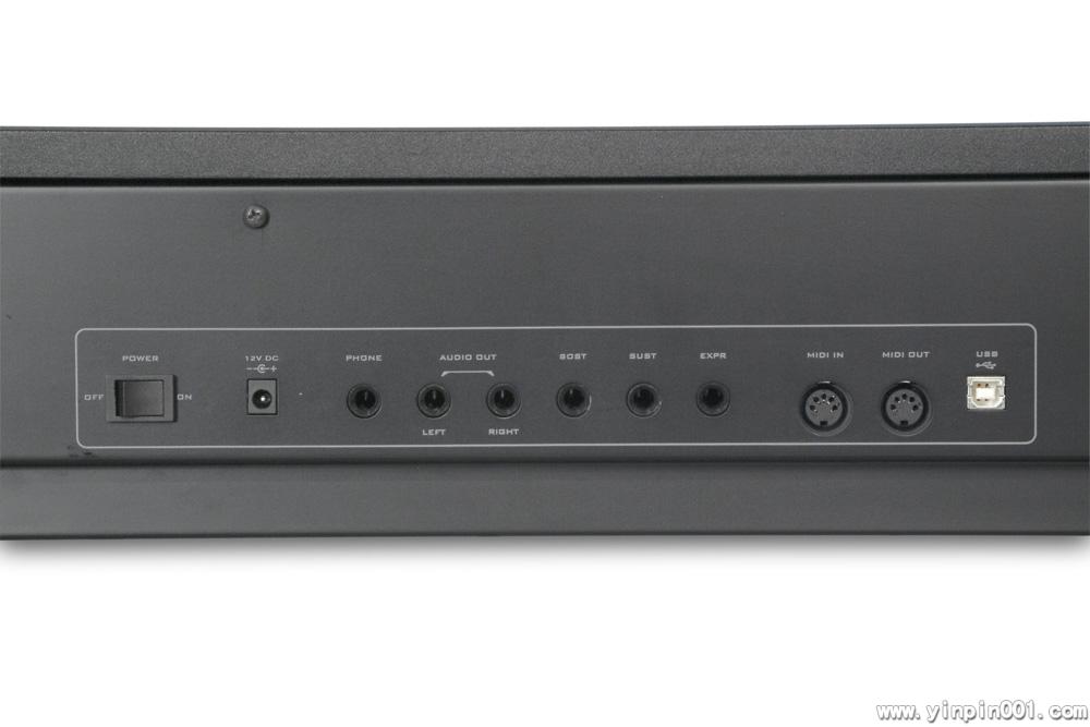 MIDI输入及输出接口可与所有的标准MIDI设备进行连接。ProKeys 88还配有演奏控制参数,这是在传统电钢琴上少有的,包括滑音轮(pitch wheel),调制轮(modulation wheel),两个脚踏输入接口,表情(expression)踏板输入接口及触后(aftertouch)。三个不同的范围可通过ProKeys 88的组合分区及分层功能来使用,这可以使每一个传送控制个别的MIDI通道。你也可以用前面板按键来进行音色变换(program change),通道选择(channel),音色库(bank)MSB及LSB 及local开关等。