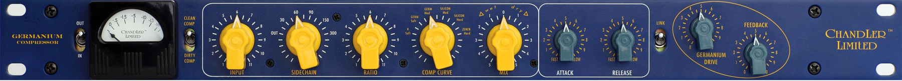 Chandler的系列设备中的第三个是GERMANIUM压缩器。Germanium压缩器采用和GERM前置放大器和均衡器一样的纯A类放大器,并且是平衡变压输入输出。压缩电路采用一个FET(场效应晶体管)增益衰减元件,但是具备所有GERM设备的特性和灵活性。Chandler Germanium压缩器上最显著的新增功能包括:WET(湿)/DRY(干)混音(压缩器内的子混音)、压缩器曲线(用各种二极管组合来选择曲线拐点)、CLEAN/DIRTY压缩和旁链滤波器。GERM压缩器的许多参数是经过大量录音棚使用和听音后才特别设定的,而不是通过检测仪器的过多分析来设定的。因此这个压缩器非常适合音乐编轨、混音和母带处理。