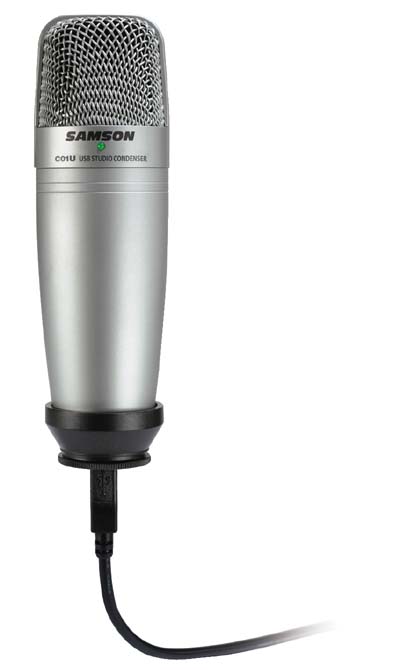 samson C01U,全世界第一款USB电容话筒.该话筒以samson最广受欢迎的C01为基础,内置AD转换器,直接将声音转化为数字格式输出,将传输过程中的信号损失降为零,另外用户使用时将无需另外的幻象电源设备(调音台、话放等),直接将话筒插入电脑的USB接口即可马上录音。