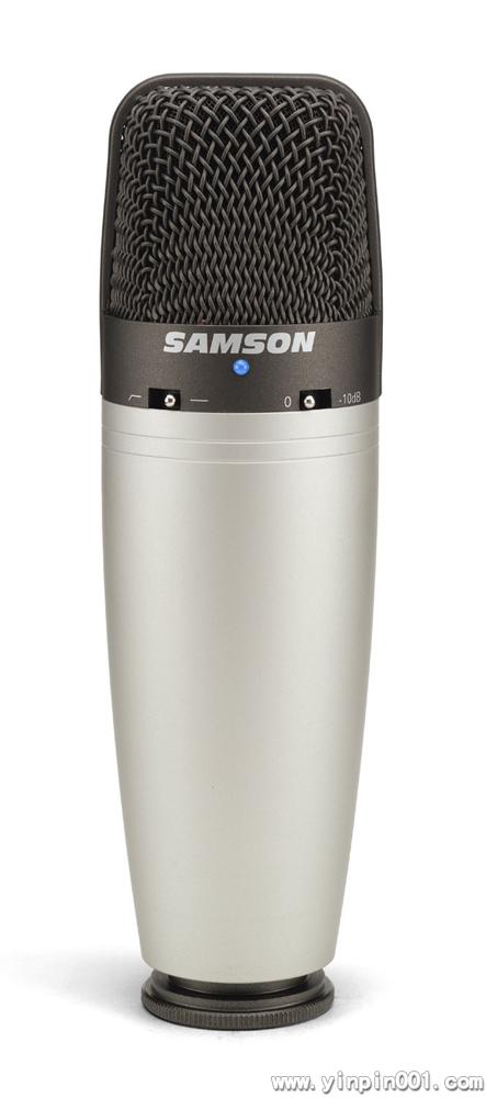 Samson C03 电容话筒的C03提供了大震膜录音棚话筒所能具备的所有功能。它有平滑的人声响应、丰满温暖的低音和延展性很好的高频部分。精细清晰的响应贯穿了整个频响范围而且绝无刺耳的声音。另外,它还具有杰出的瞬态反应、处理大声压级信号的能力(>140dB)以及可切换的超心形、全向和8字形的多指向性。