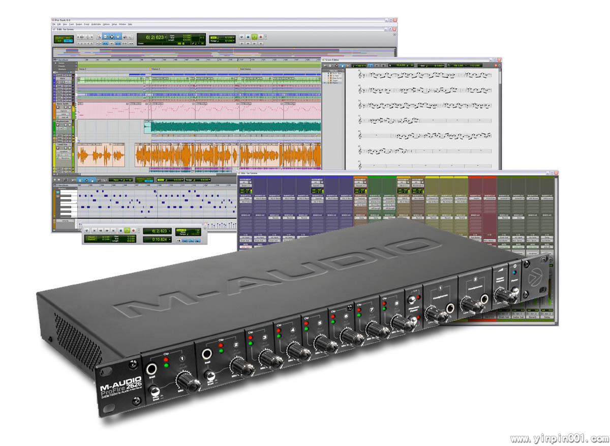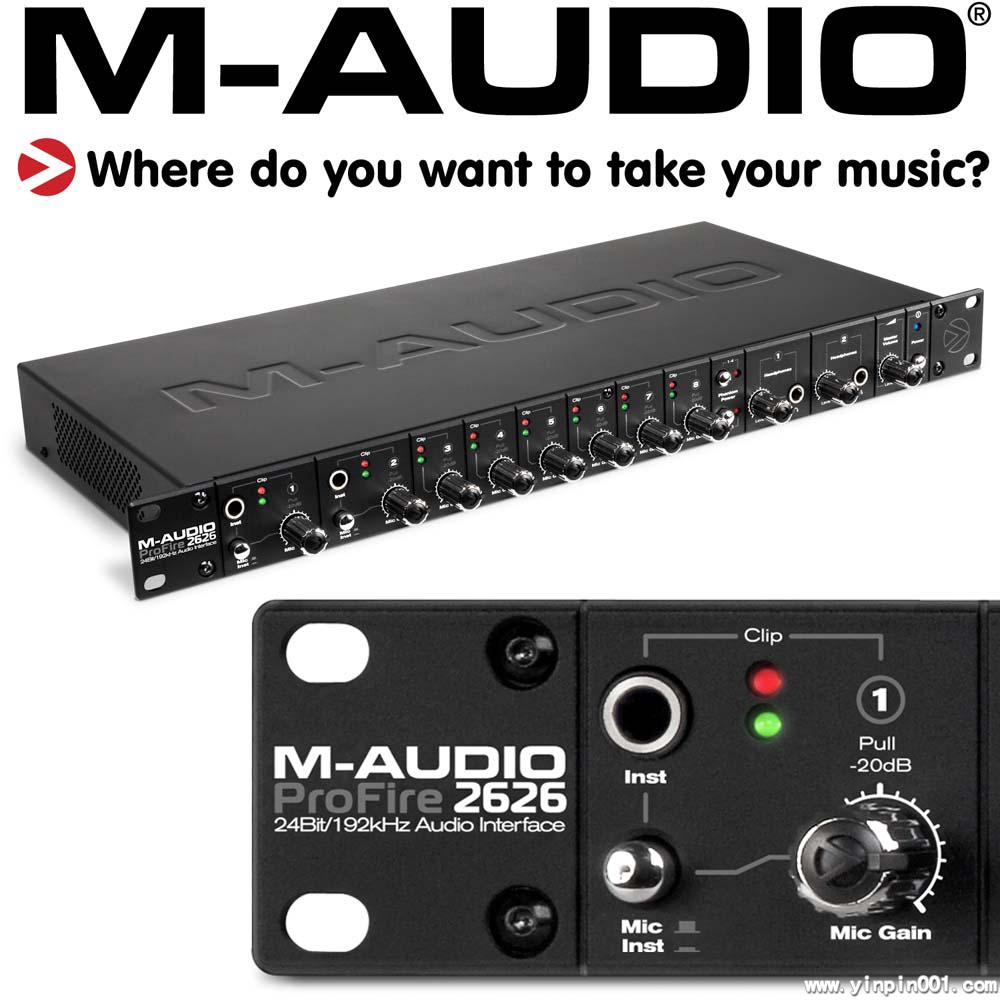 以M-Audio公司多次获奖的火线音频产品为设计蓝本,在PC或Mac为平台的录音系统中,M-Audio ProFire™ 2626将展现其新一代的完美品质。M-Audio ProFire™ 2626提供了26 x 26同步输入/输出,板载DSP芯片可支持高达52路的音频数据。它还具备了你想要的一切功能—包括ADAT、S/PDIF、word clock、MIDI接口及8通道模拟输入—采用曾获大奖的Octane™话放技术。采用了著名的Jet pll锁相环数字技术,确保了在各种情况下都能达到24比特/192K赫兹的采样率,准确还原原始音质。另外,ProFire 2626拥有简便的火线连接,超低延迟,双耳机监听端口,前面板1/4”乐器输入端口,并可作为独立调音台使用。完美兼容Pro Tools M-Powered™。