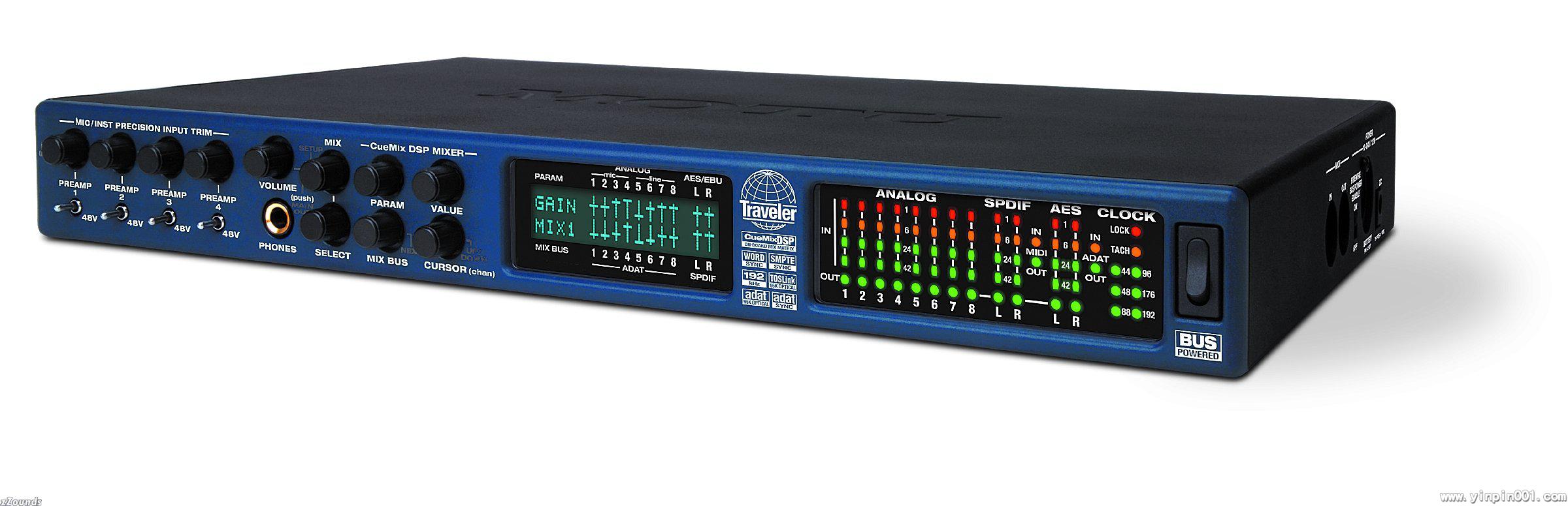“旅行者”还能够支持多达4种立体声监听音箱混音(分配在任何4对数字或者模拟输出接口均可),比如,独立的监听音箱混音可以设置到主要的输出接口和耳机插孔,与此同时,2条额外的立体声总线则可以用于向混响设备或者其它外围设备发送或者接收循环。每一种混音都能够支持这20个输入接口。其所具有的一个“CueMix返回”功能,能够使使用者将这4种CueMix DSP混音中的一种再导回电脑。