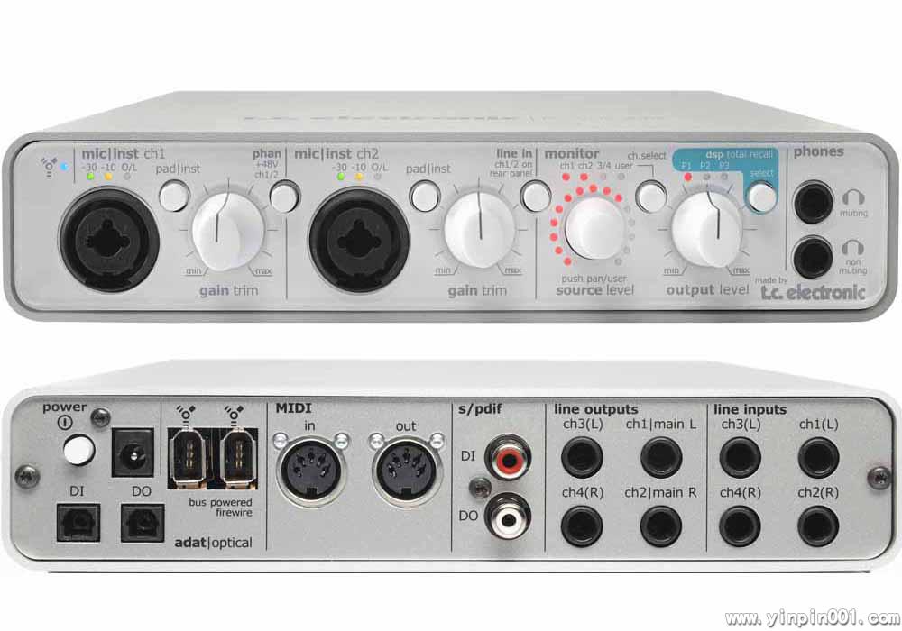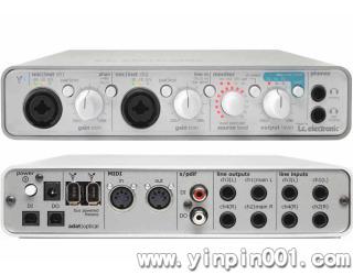 提供14进14出音频接口:2个线性/话筒/插入接口,2个线性输入接口,4个线性输出接口,8个ADAT输入/输出接口,2个同轴和光纤的SPDIF输入/输出接口