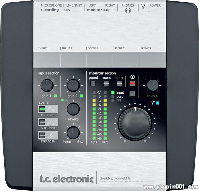 Desktop Konnekt 6是桌面版的火线音频接口,它有着很大的音量调节旋钮、高精度的电平表、TC的IMPACT话放、内置一个DSP混响M40 Studio,可通过VST/AU插件调用。
