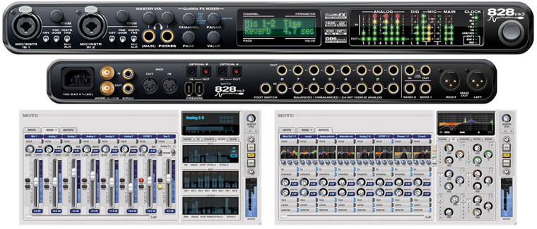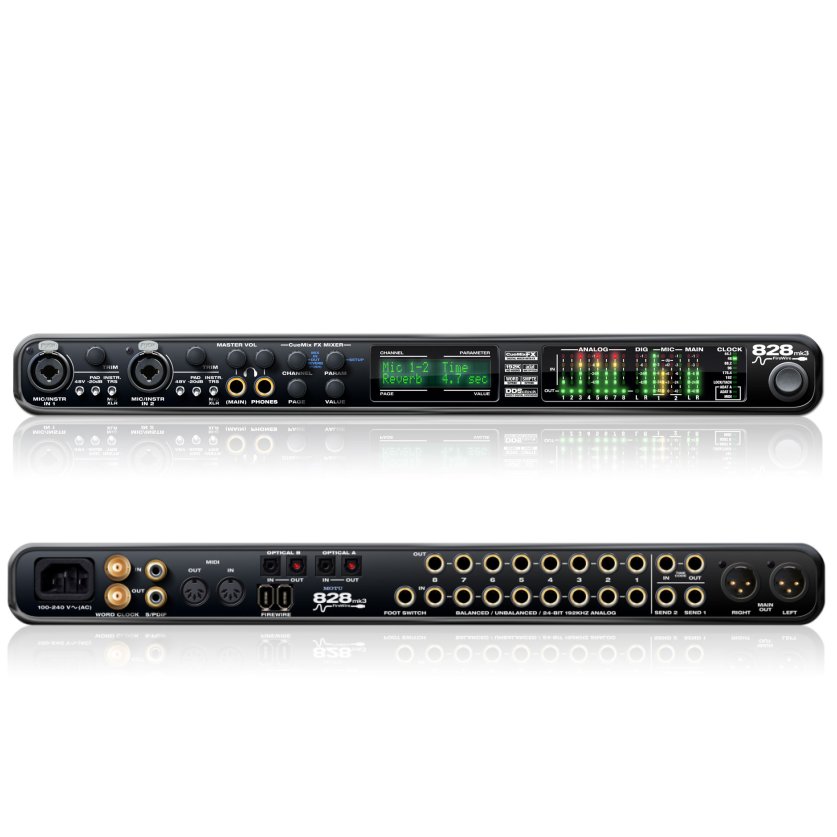 828mk3,不仅仅是828mkII的简单升级,而是增加了很多全新的东西。包括32bit符点的高精度DSP效果器,更多的接口,最高192kHz的音频转换精度,真正的Hi-Z吉他输入接口,电平过载保护,可对所有输入接口进行数控模拟的输入增益,双ADAT/TOSLink光纤接口,MIDI接口等等。