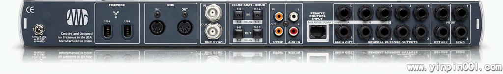 FireStudio装配了输入/输出,是一个极为灵活的可扩大录音系统。你可以在后面板上添加额外的前置放大器或者模拟输出接口。你可以为三个机架上的24个话筒前置放大器添加两个DigiMax FS。FireStudio上有字时钟输入/输出同步,MIDI输入/输出和SPDIF输入/输出。