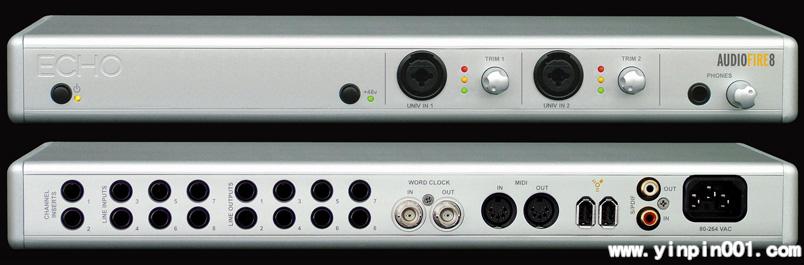 Audiofire8近期终于在中国上市了。Echo的产品一直以稳定、简单、好用、高品质而著称,Audiofire系列产品可以说是Gina3G之后Echo新的“热点”产品。Audiofire系列有两个产品:Audiofire8和Audiofire12,前者比后者少了4路模拟输入/输出接口,而且面板上不提供电平表,但是Audiofire12全部都是TRS大三芯平衡接口,而Audiofire8有2个XLR/TRS混合输入接口,可以连接吉他和话筒,提供前置放大器和48V幻相供电。对了Audiofire8还支持GSIF 2.0和3.0的驱动,使你能够以最佳状态使用GigaStudio。