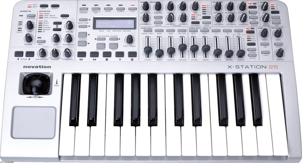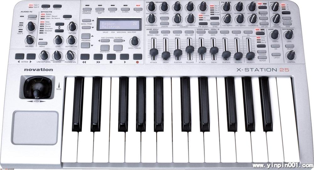 X-Station 25的音频接口提供幻象供电的前置放大器,24bit转换器,数字SPDIF输出,耳机与监听的电平都可独立调节。MIDI接口为1进2出。