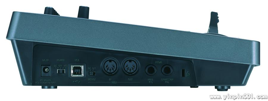 键盘的背面没有连接口,所以你可以把电脑显示器,ASCⅡ键盘,鼠标和鼠标垫或笔记本电脑放在键盘后面—很方便使用,这种特殊的设计很适合学生在空间有限的教室里使用。所有的接口都在左侧---USB,MIDI IN/OUT加上延音和表情踏板接口.PCR键盘是由USB总线供电的,所以不需要电源。(PSB系列电源需单独购买)。MIDI传输可以通过MIDI OUT和USB接口,很方便的与高级的MIDI系统结合。