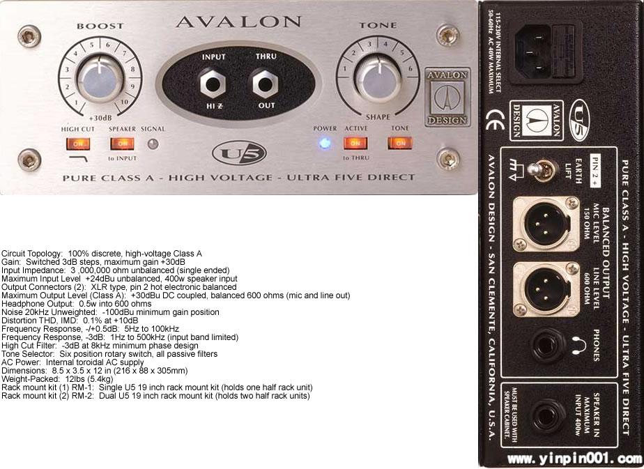 Avalon U5高压、DI输入的前置放大器将音色选择器、滤波器有效的连接起来,提供了宽广的信号平台,其高阻抗直接输入适合吉它以及合成器设备的使用。