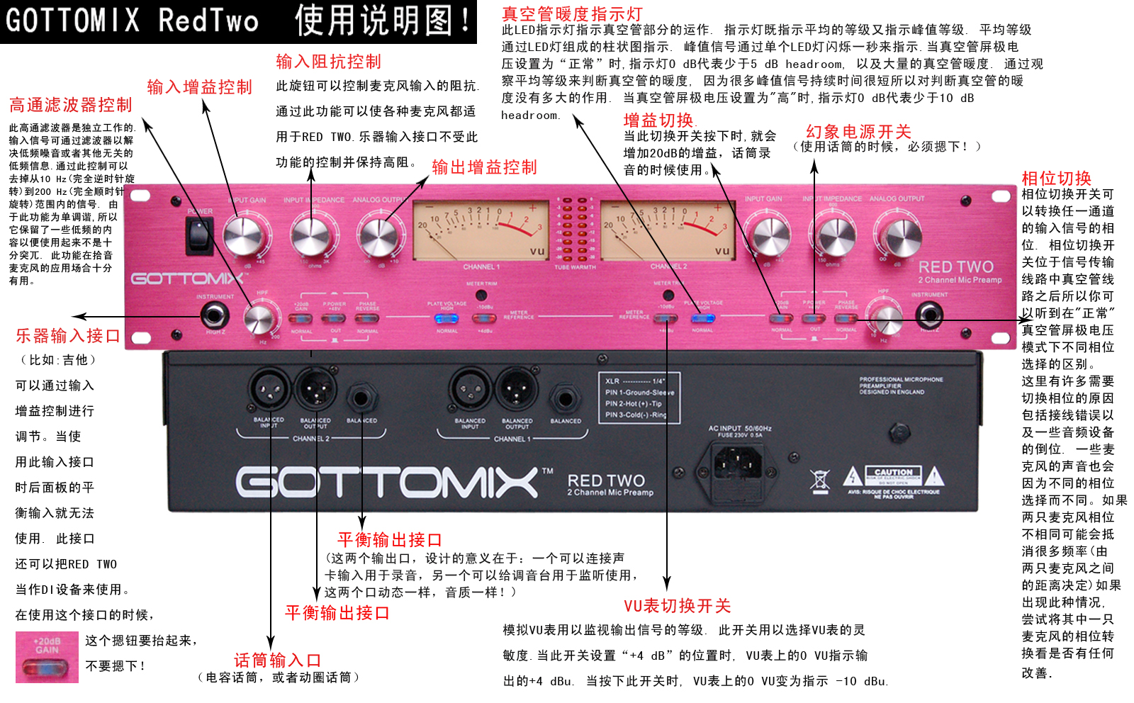 来自英国的 Gottomix RED TWO 专业双通道麦克风前置放大器使用具有可变输入阻抗和可选真空管屏极电压的 A 级双通道功放设计 , 以创造最通用的高性能麦克风前置放大器 。Gottomix RED TWO 可以提供无以伦比的暖声,表现力以及清晰度,由于其极低的噪音,宽广的频响范围,超高的动态范围,被国内外录音棚普遍采用作为首选话筒放大器使用!