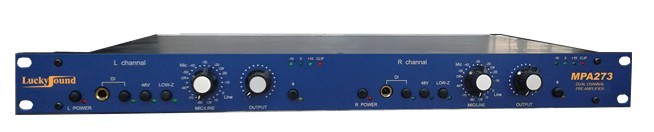 Luckysound MPA273 话放均有三个输入口:话筒、线路、DI。话筒放大器是变压器平衡输入,增益调节范围+20dB到+80dB;线路放大器也是变压器平衡输入,增益调节范围-10dB到+20dB;DI输入为高阻输入,适合乐器的直接输入。其中,MPA173E提供了不同的均衡调节点和高、低通滤波器。