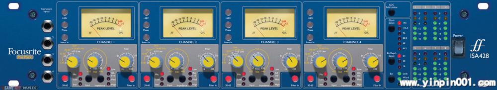 四通道ISA系列变压器偶合话筒放大器 Focusrite的经典话放设计的优点在于极佳的共模抑制,卓越的过载余量,极低的本底噪音和超宽的频带宽度。