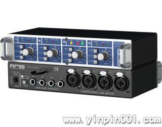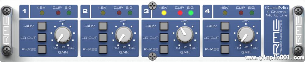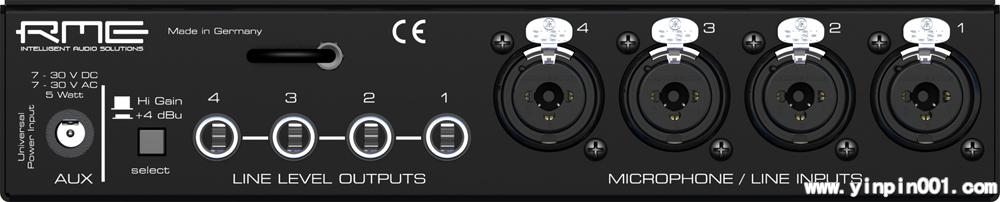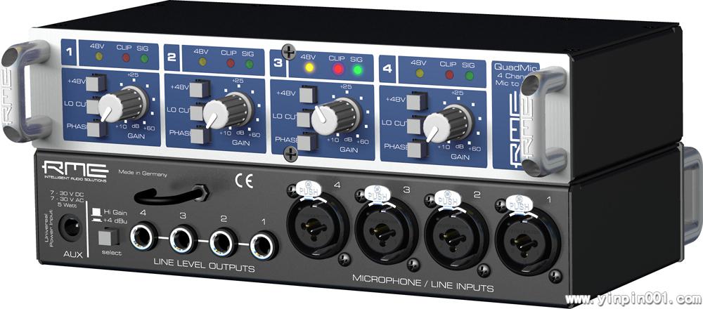 QuaMic提供4个平衡XLR麦克风输入,每通道有开关控制的48V幻象电源,低频修剪滤波器和相位反转开关。扩大量在10到60 dB之间,有LED显示信号、修剪和幻象供电。面板上还有选择-10dBV, +4dBu甚至更高(+21dBu)输出电平的开关。RME通用的机架附件可以把固定在任何19"机架上,内置的专业开关电源可以适应全世界的电源,即使供电不足或带有噪声也无妨。