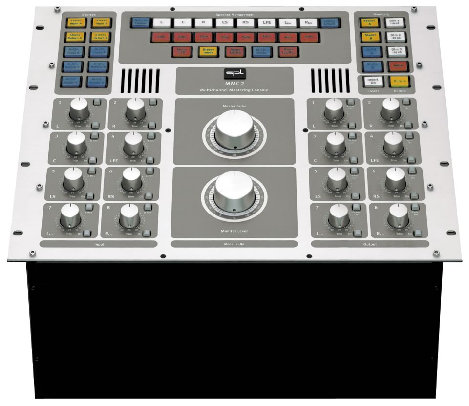 在一个立体声环境中通过音色修饰台连接效果器,并在音频通道中指定功能,还是相对容易一些;不过,在处理背景渲染时,这项工作却变得越来越繁杂、耗时,为了简化这种工作,推荐使用自动化的8 x 8通道音色修饰台(SPL MasterBay)配合MMC2使用。