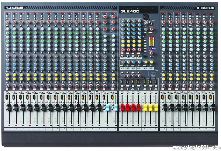 GL2400 机型是一款紧凑型、双功能的、拥有左右信道、单信道叠加、4 编组、6 个辅助通道、7×4 矩阵的调音台。其设计规格从 16 到 40 通道,包括 2 个立体声通道。