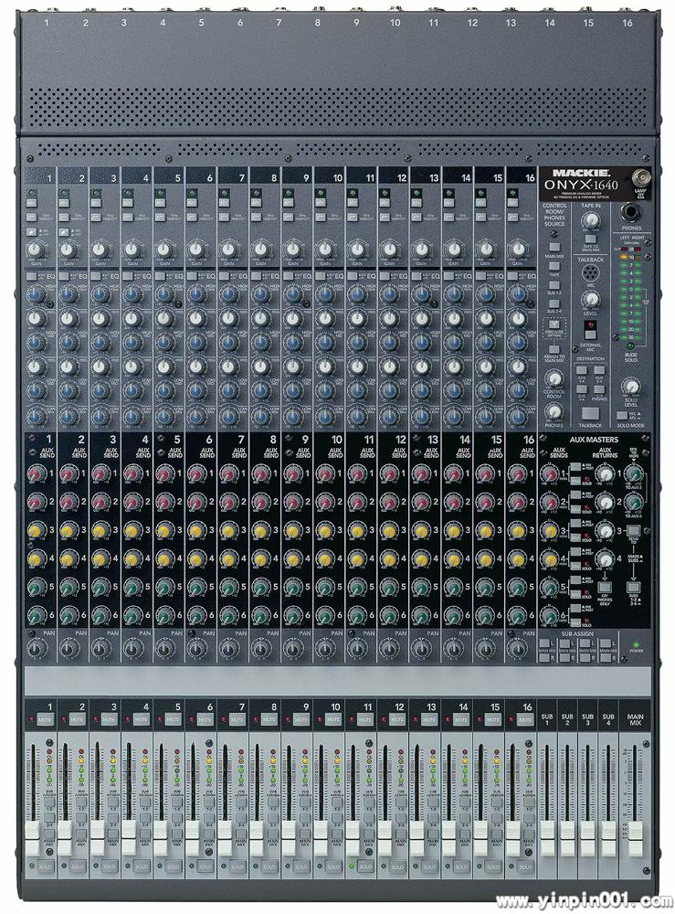 ONYX1640 超级的16通道/4总线小型模拟调音台。全新的16路ONYX 话筒前置放大,可与单独话筒前置放大器相媲美。