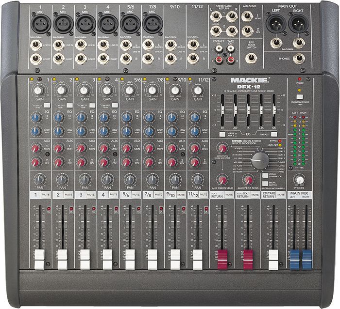 DFX12包括3种通道条风格:通道1-4 连接话筒或单声道线路电平声源,跟DFX6的通道1和2完全相同;通道5/6 和 7/8 连接话筒或立体声线路电平声源;通道9/10和11/12连接立体声线路电平声源。