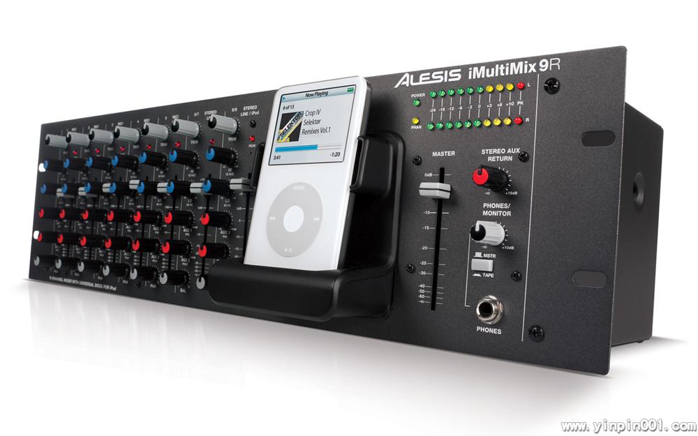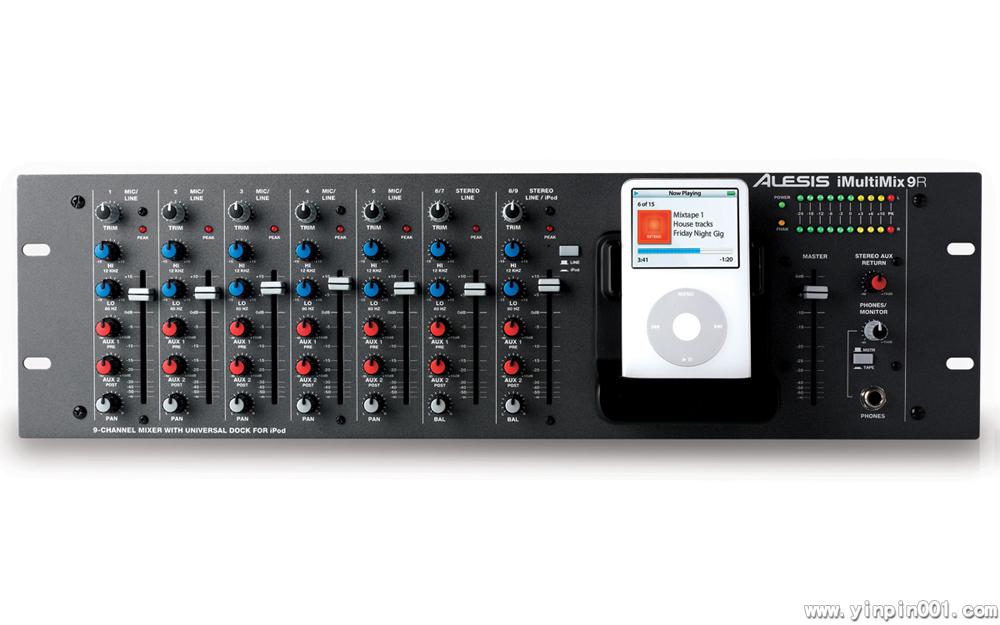9路机架模拟调音台,可直接连接iPod,将iPod也作为一路立体声输入,而且还可输出iPod的视频。一共有5个Mic/Line输入,带有插入接口,非常容易地对输入信号进行处理。2个立体声输入,可以选择来自线路或iPod。每个通道都有2段均衡,一共有8个推子。