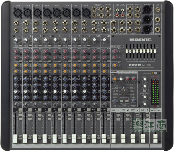 CFX mkII系列调音台包含了小型现场扩声所需要的全部功能特性以及更多的超值特性:Mackie话筒前置放大器、4 个子编组、精确的9 段式立体声图示式均衡器、内置EMAC? 32-bit 数字式多效果处理器等,可以非常方便地与Mackie有源扬声器系统一起,组成一套完整的扩声系统。