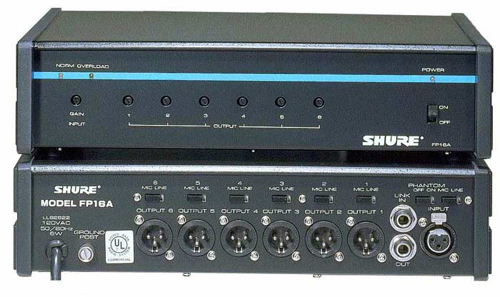 用于发送多个音频输入的 1 输入 6 输出便携式音频信号分配放大器。作为便携式压电桥的理想之选。包括:XLR 变压器平衡输入和输出(每个都可切换为话筒或线路电平操作)、幻象电源、连接其它 FP16A 设备或外侧设备的连接插口、可用螺丝刀调节的增益控制。A16R 可安装支架。电池(三块标准 9 伏碱性电池)或 120/240 Vac 电源。
