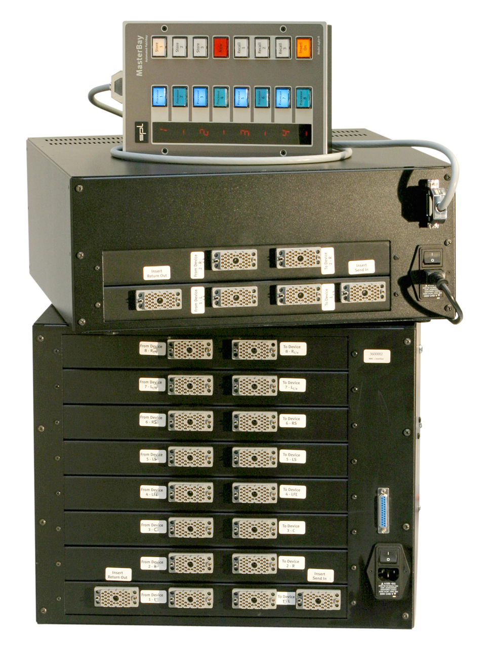 ●SPL MasterBay 可以具有双声道及8声道的型号供选择,全部采用平衡式、被动型插入接口,并通过MasterBay遥控器控制,遥控器可以放置于工作台上或安装到工作台内