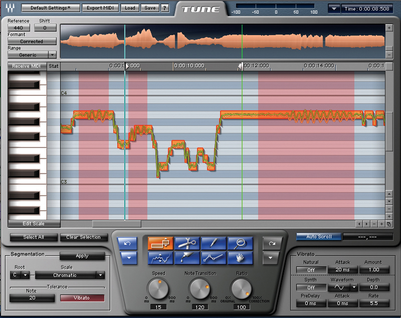 波形显示的音调编辑图表,时间线,钢琴卷帘和音调编辑工具