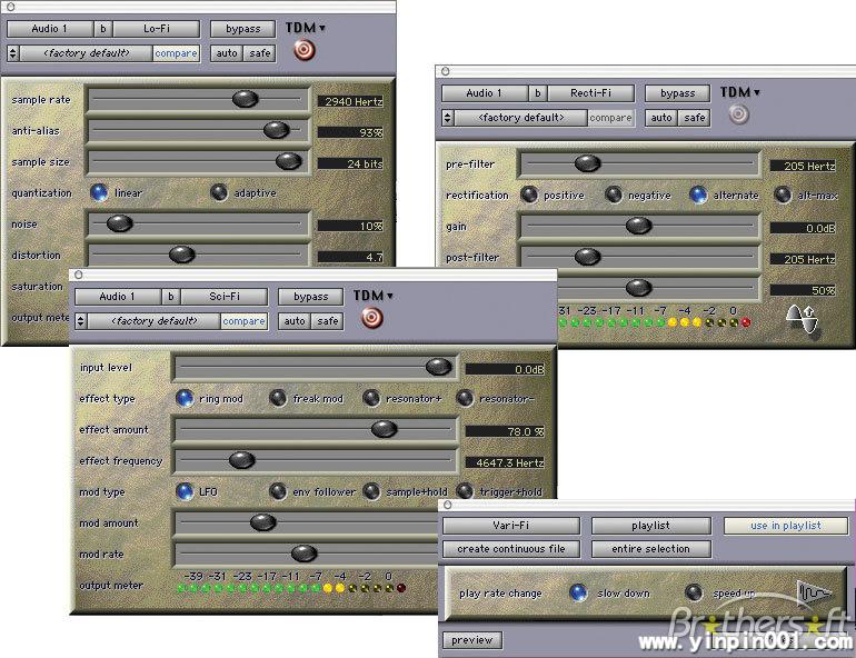 D-Fi套装有4款插件(Lo-Fi, Sci-Fi, Recti-Fi, and Vari-Fi),支持TDM,RTAS,和AudioSuite环境。Lo-Fi提供降低Bit的音质复古处理;Sci-Fi可以添加模拟合成的Ring调制,频率调制,以及可变频率振荡器;Recti-Fi提供Super或Sub谐波合成,Vari-Fi可以对硬盘上的文件进行变速。