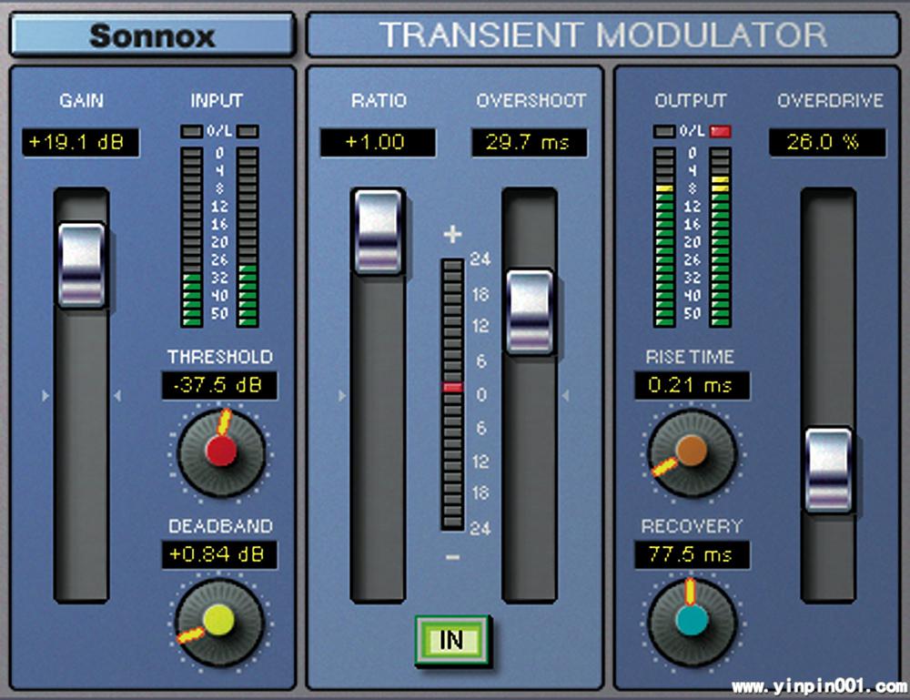 Sonnox Transient Modulator瞬间变量调节器,能使通过瞬间变量调节器来改进音频素材中的信号的动态电平,将效果音频素材中体现的靠前或靠后,通过设置可以使乐器的音色变重或变的柔软。