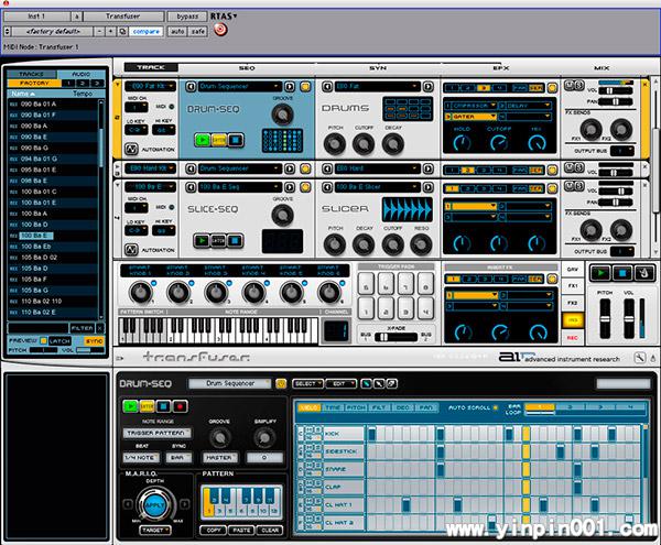 如果您还不满足, 可将自己的ACID, REX, Apple Loops, AIFF, 与WAV文件拖到Transfuser中进行一些小切片与叠加, 为原来的音色库注入新生命. 创意大爆发的您可能已经在打Pro Tool工程里那些Region的主意了吧. 现场演出 Transfuser 同样带有现场演出的功能. 您可以使用自己的MIDI键盘或控制器触发一系列您编辑的Pattern, 即兴弹奏, 编排音序或实时修改节奏. Transfuser 的面板让您轻松指派MIDI音符与MIDI控制旋钮来虚拟控制Pattern触发, 或其他各种控制, 包括各种模块与参数控制, 智能旋钮, 触击垫, 4*八度键盘与Crossfader.