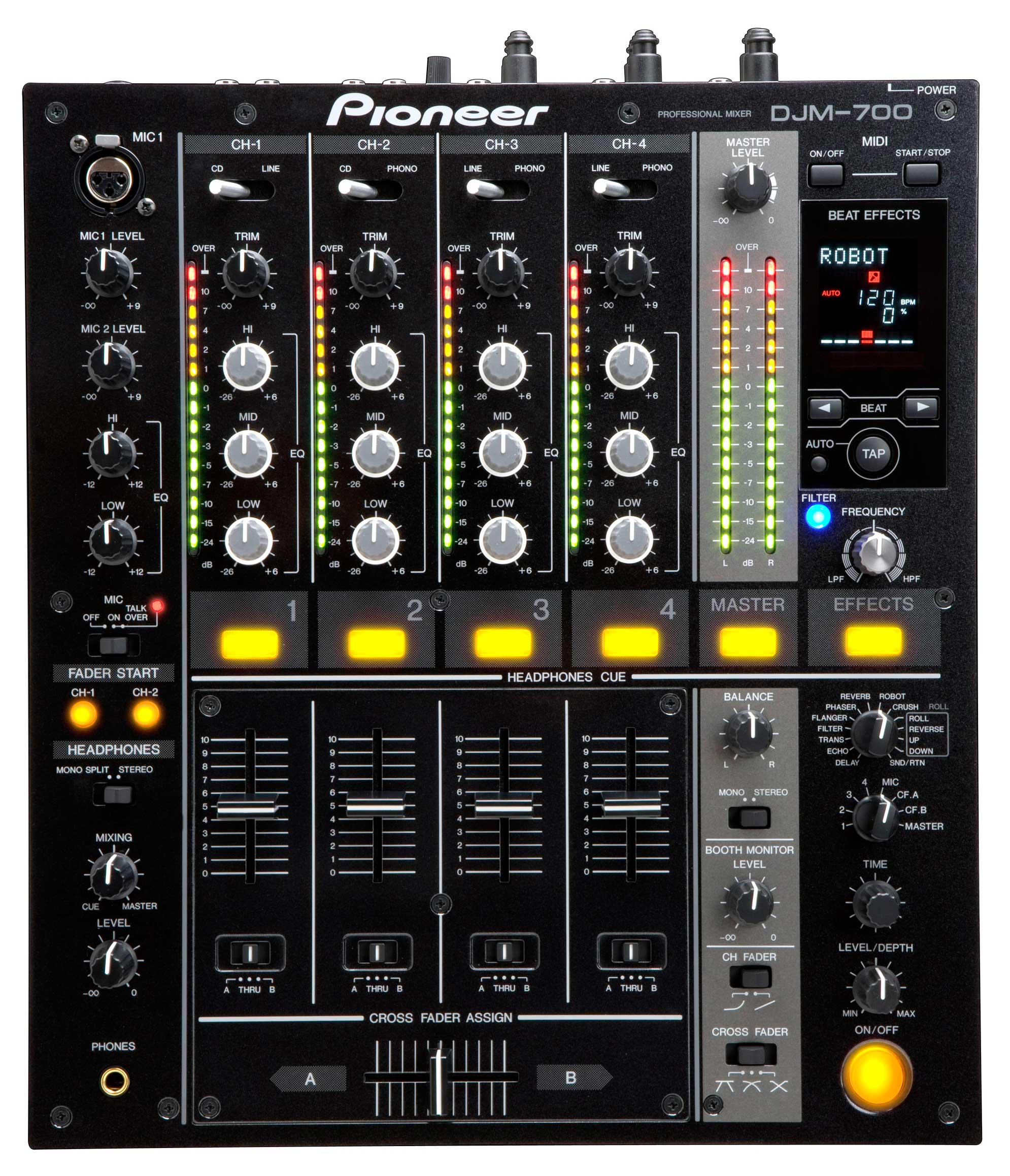 1.96kHz/24bit高品质数码采样系统从DJ播放器输入的模拟信号经由最短的信号线路,转换成96kHz/24bitd高质量数码商频信号,并达到了数码浊音的最高质量.混音是由32bit的DSP完成的,声音不失真,DJ可以用滤波器表现出极强的效果.而且,为了最大限度地体现个性,DJM-700继承了DJM-1000/DJM-800的高品质音频技术,比如高强度底盘减少不少要的振动,这些振动会反过来影响音效,电子噪音消除双层保护结构,完全平衡输出电路等等.而且它实现了俱乐部里音乐的高保真和强力度.