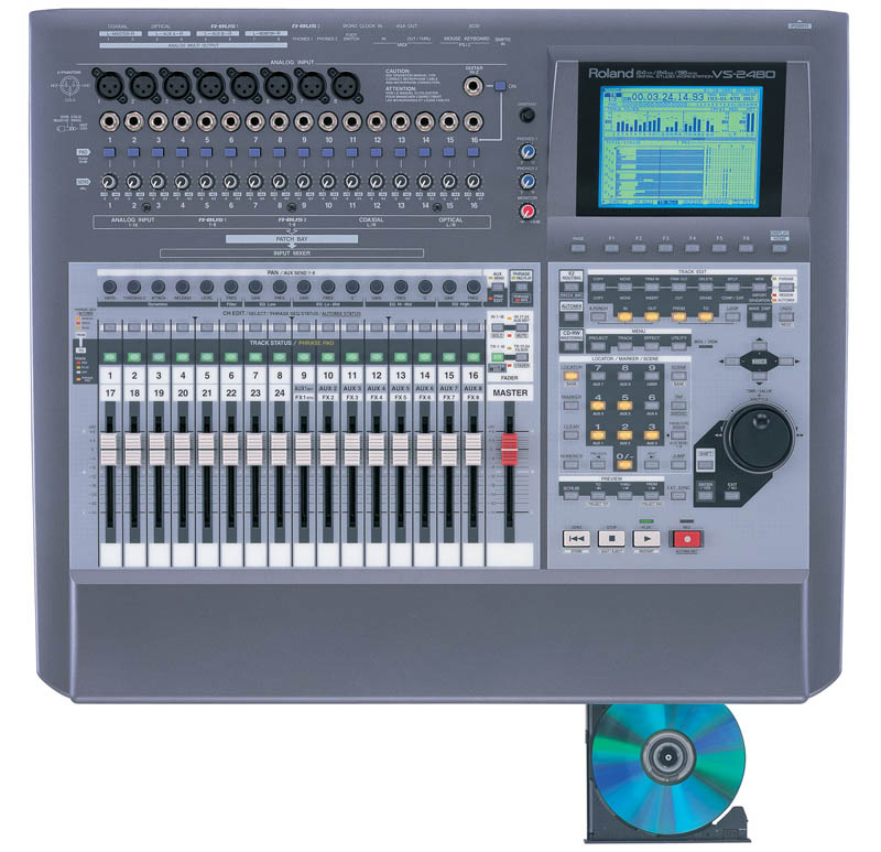 VS-2480 24轨数字录音工作站,是Roland V-Studio系列科技的巅峰之作。它是世界上第一款提供完全24音轨/24位数字录音、内建效果器处理、CD烧录功能(选配)…等等的All-in-One硬盘录音座。这一款极度魅力的机种,已远远超越其它任一款竞争产品。它另外也具备有非压缩性录音的超完美音质、64声道的数字混音功能、17个自动马达推杆、以及VGA视讯输出-,并同时可利用鼠标与ASCII键盘在VGA屏幕上直接进行快速的编辑操作!V-Studio又再度创造新的历史!
