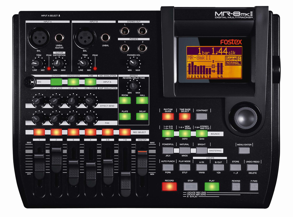 MR-8 MKⅡ有AB两条物理输入通道,通道A分为INT MIC(内置麦克风)、GUITAR(吉他)和MIC/LINE(话筒/线路)三种输入选择,通道B为MIC/LINE输入,其中通道A的吉他输入可以加入失真效果并可调整失真量。随后乐器及人声的原始信号便通过录音通道选择矩阵进入录音机的1~8通道记录在CF卡上,同时原始信号也通过推子输出到立体声母线上;在推子与母线之间可以选择各种各样的效果器对各个通道信号进行单独的处理,包括:混响器,延时器,吉他放大器,失真效果器,仿真效果,均衡器等。MR系列多轨机的录制格式全部为标准的音乐工业44.1kHz、16Bit无损WAV格式,由此最终的录制的混音文件可以通过机身后面的USB端口传输到PC或MAC主机上进行保存或二次加工。