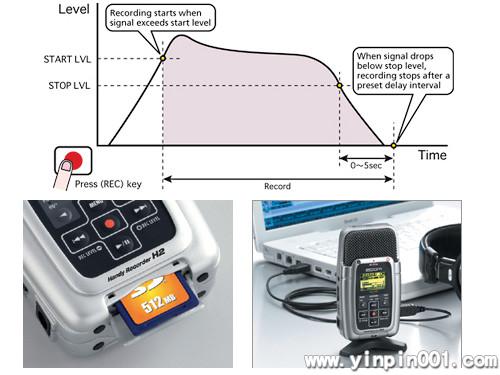 Zoom H2可以录在SD存储介质上,可以高达4GB容量,而它本机则配有512MB的卡。另外你可以设置文件格式为各种位数与采样频率的组合,根据情况可增加录音时长。可以在96kHz(DVD品质)、48kHz(DAT品质)、44.1kHz (CD品质)与MP3到320kbps间选择。可变位率(VBR)数据格式还可以优化存储功能。H2的自带USB界面,可以有效管理文件,移动其到PC或MAC电脑中进行存储,并可用你最爱的数字音频工作站软件来进行编辑。你也可以把H2当作USB话筒直接将音频录到计算机中。