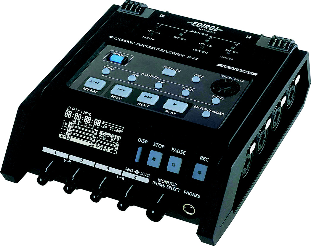 Roland R-44是一款可以放进很小的便携背包里的为专业人员而设计的录音设备。它可以进行4轨无压缩的音频录制,可以调节采样精度(16-bit 或 24-bit)以及采样频率(44.1kHz/48kHz/88.2kHz/96kHz)。R-44采用SD卡或大容量SDHC卡作为录音介质。没有任何运动部件,保证了录音过程中的安静可靠。