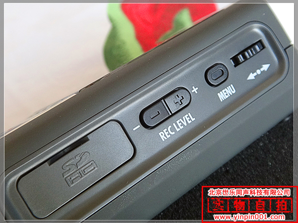 在h4n的右侧面板上, 最上面是 Jog Dial选择键 和Menu 菜单键, 两个键在一起,使您可以在菜单上飞快的选择您要使用的功能。 中部的Record level键用来选择录音音量。 最下面的小橡胶门内是您放置SD储存卡的地方。