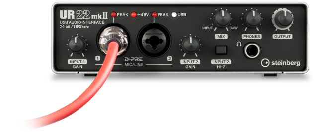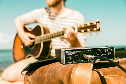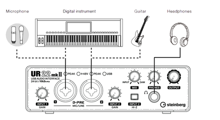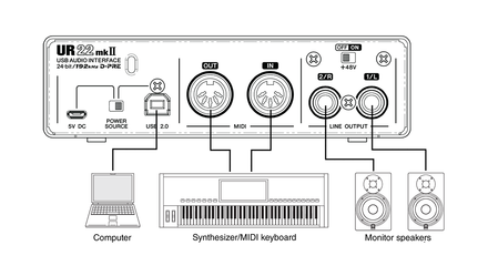 尽管其尺寸精炼,但UR22 MKII可以连接到各种音响设备,乐器等等。它的功能远远不止连接线路输入或连接动圈话筒,UR22 MKII还能使用+48V幻象电源连接到电容式话筒,或者连接电吉他。板载MIDI端口不仅能与键盘连接,还能与鼓垫,控制器,老式的鼓机等设备连接,只要它们支持MIDI标准。而即使是在高CPU负载下,UR22 MKII的驱动程序架构已经被设计为在所有的音频和MIDI流之间完美同步。