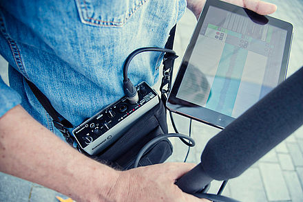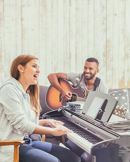 通道1和2的两个主音频输入可以实现为组合输入,您可以同时插入大量音频素材。在创作新专辑时,可以实现一个歌手和吉他手即兴歌曲的录制。在这里,电吉他插入内置Hi-Z模式的Input 2,电容话筒插入Input1,并且都可以从监听音箱进行监听,且没有延迟。或者Input 1和2可以连接两个放置位置合理的电容式话筒来捕捉一个更大的表演空间,用来录制合唱团或小乐队。