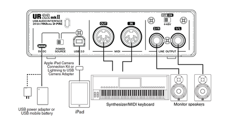 UR22 MKII为iPad做好了准备,并支持ipad进行专业的录音。用CC模式连接到你的iPad,使用无论是相机连接套件或USB摄像机适配器均可。外部电源,如手机电池或USB电源适配器,可以插入微型USB接口,给UR22 MKII提供足够的动力来使用更先进的设备,如需要幻象供电的大振膜电容话筒。
