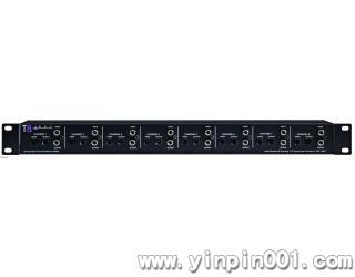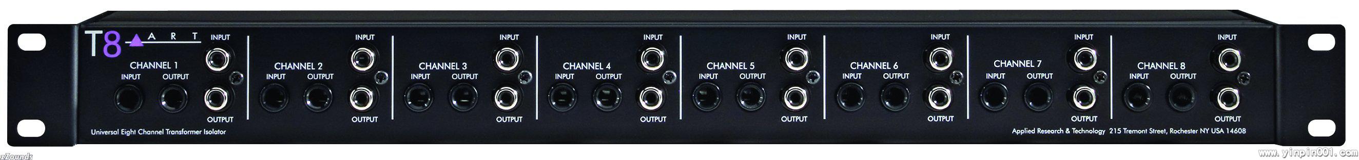 阅读说明: 保留使用说明书以供日后参考这些安全与卫生。 这里请注意所有的警告和印刷设备。 按照经营 说明书印刷本用户指南。 不要打开: 没有用户可维修的部件。 将任何服务工作只是技术人才。 水分: 为了减少火灾或触电危险的电气设备不暴露在雨中,或潮湿环境中水分或使用潮湿。 不要将液体容器上 它,这可能会蔓延到任何开口。 环境: 防止过度的污垢,灰尘,热,振动时操作和储存。 避免烟灰,饮料及烟溢出,尤其是 与烟雾机。 处理: 为防止损坏的控制和避免野蛮装卸和化妆品过度振动。 在运输过程中保护的损害控制的。 使用 如果你需要足够的填充到船舶的单位。 为了避免伤害自己或损坏时要小心,起重设备,移动或携带单位。 服务: 请向合格的人员只有技术。 简介 感谢您购买隔离艺术T8通用八通道变压器。 这是一个稳如磐石,道路worthly 8通道隔离变压器。 “哼”的一 音频系统通常是由循环影响的天线像。 这些循环可以轻易拿起为60Hz(或更高谐波)建立的电气接线哼哼。 通常情况下,这些循环有理由连接通过,通常称为“地循环”。 最安全的方式,以消除不必要的噪音是的T8。 T8状态是一种质量完全被动的音频接口,使用八个高性能低失真变压器完全独立的输入和输出信号的理由, 从而隔离两个系统,减少嗡嗡声和接地回路噪声。 的T8的音频变压器有一个非常平坦宽阔的频率响应和可 处理高信号水平,同时保持一个独立的平衡输出。 这使各种各样的T8信号源非常干净的和中立的声音。 该 变压器伤口1:1增益,其设计使用600欧姆到100K欧姆阻抗的。 什么进一步的隔离套小盒子的T8除了一个是它的连接的多功能性。 我们提供的XLR,¼“手机,RCA型唱机连接所有 输入和输出。 这使得它可以轻松地安装到几乎所有的音频系统,并成为类型的系统之间的所有补丁干净点。 所有¼“和RCA唱机插座 插孔在前面和后面所有的XLR上的。 你可以任意组合使用以来的插孔直接并联你也可以使用它们作为信号或水龙头 信号分配器。 T8状态的挂耳是可逆的所以你可以有¼“和RCA唱机前插孔在前面的还是XLRs。 这种布线灵活性最大化 您的系统。 您是否需要系统之间的接口基于计算机音频工作站和显示器,电缆隔离长期运行在一个固定安装, 从您的录音设备隔离多个信号源,或在许多情况下,只需一个更安全的音响系统连接两个,可容纳的T8。 19“1U的黑钢表壳及所有被动设计允许所有的T8提供永久的现场音响,年无故障服务/固定安装,DJ和几乎 任何PA的应用程序。 同样应用在AV各种有价值的Studio和。 充分发挥其功能集,坚固的结构,和高端的T8规格使 显而易见的选择。 应用: 现场声音,DJ试听 龙不平衡电缆更容易拿起哼,使用的T8,以帮助平衡这些问题和消除任何的嗡嗡声。 当DJ们设置的工作岗位上,为不同的有潜在拿起哼由于内部布线差异,使用T8消除了潜在的嗡嗡声。 一