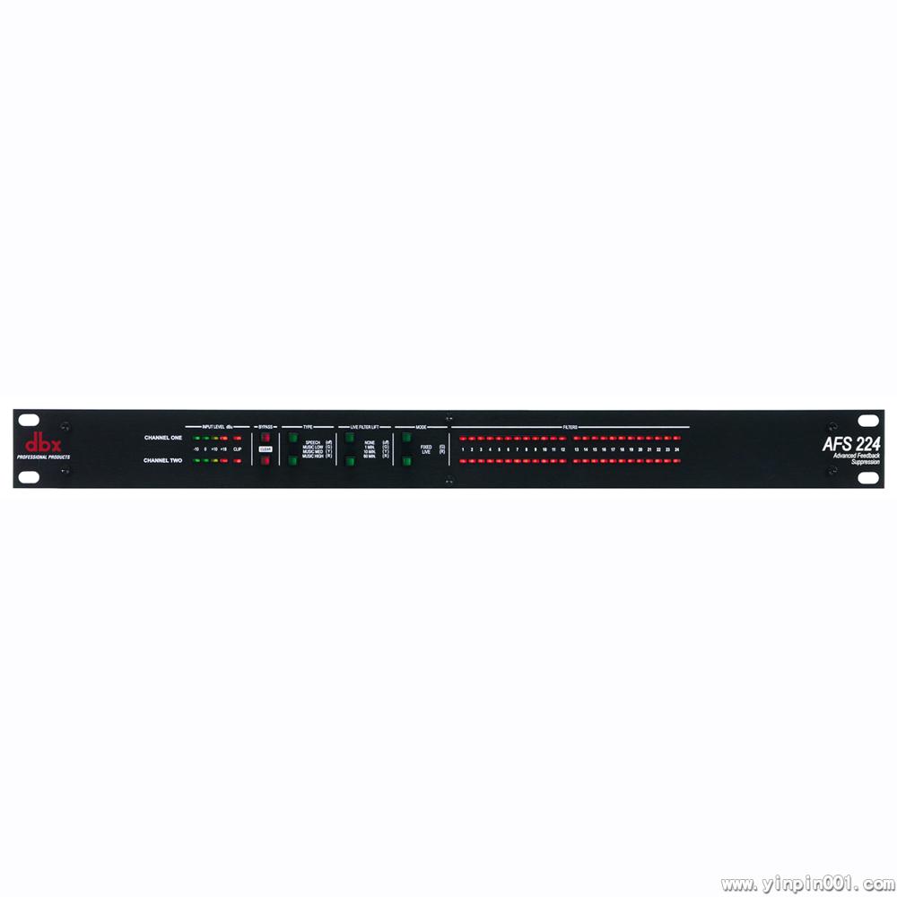 双通道高级反馈抑制器:DBX专利的高级反馈抑制技术(AFS)每通道具有24个可编程的滤波器,立体声或独立的双通道处理,可选择的滤波器脱开时间,滤波器应用的类型,包括:语言滤波器,低、中、高,三段音乐滤波器,输入通道测量表,每通道24段滤波器测量表,电子平衡的输入和输出端口XLR和TRS,让用户尽可能完善地消除声反馈