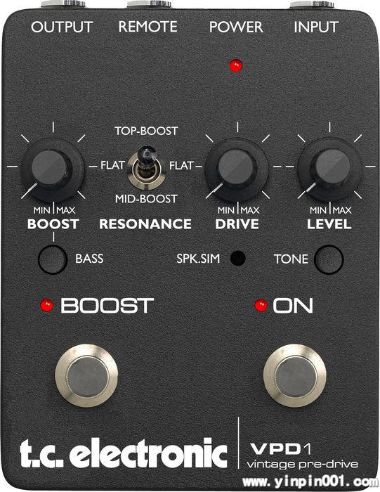 VPD1可作为G-System的踏板配合使用。它有"Drive", "Level", "Tone" 以及"Boost"四个旋钮,以及独立的"On"、"Boost"脚踏开关。