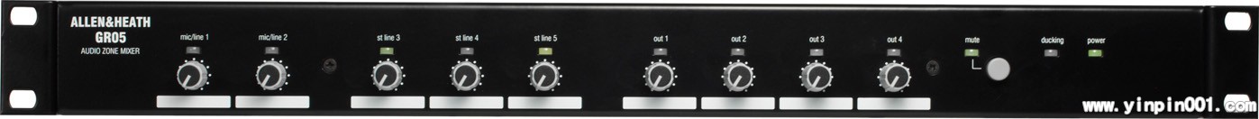 GR05 是用于音效安装的一种物美价廉的 "即插即用" 模拟 1U 架解决方案,可以混频 2 个话筒、3 个立体声源和 4 个输出区。它为操作人员展现了一个非常简单的界面,却为安装者提供了不可思议的配置灵活性。它提供工具如电平匹配、测量、路由矩阵、EQ、ducking、VCA 遥控等,以及可扩展性来满足每个安装的